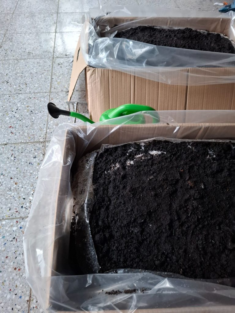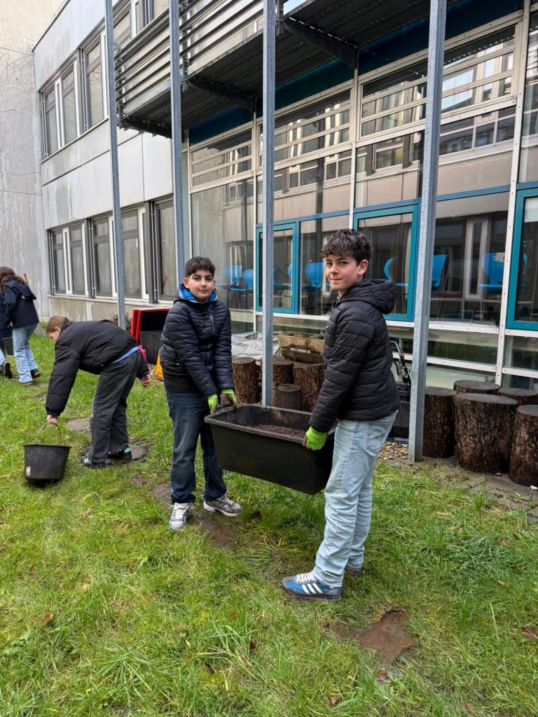 Doch nicht nur draußen im Garten tut sich etwas: Auch in den Klassenzimmern wird es in den kommenden Wochen spannend. Die Klassen 5a, 5b und 5c nehmen erneut am Projekt „Champignon-Zucht“ teil. Unterstützt werden sie dabei vom Bund Deutscher Champignon- und Kulturpilzanbauer (BDC) e.V., der allen drei Klassen spezielles Pilzsubstrat zur Verfügung stellt. Dieses Substrat bildet die Grundlage für das Wachstum der Champignons. In den nächsten Wochen heißt es für die Fünftklässlerinnen und Fünftklässler: pflegen, beobachten und staunen! Mit etwas Geduld können bereits im März die ersten frischen Champignons geerntet werden.