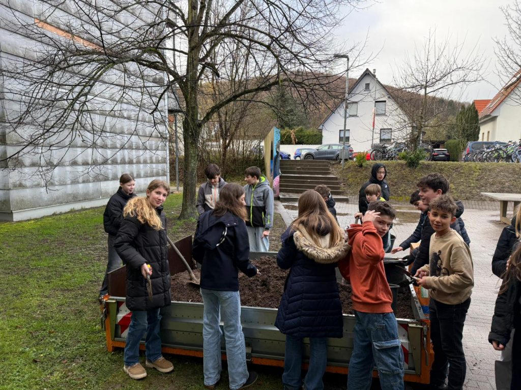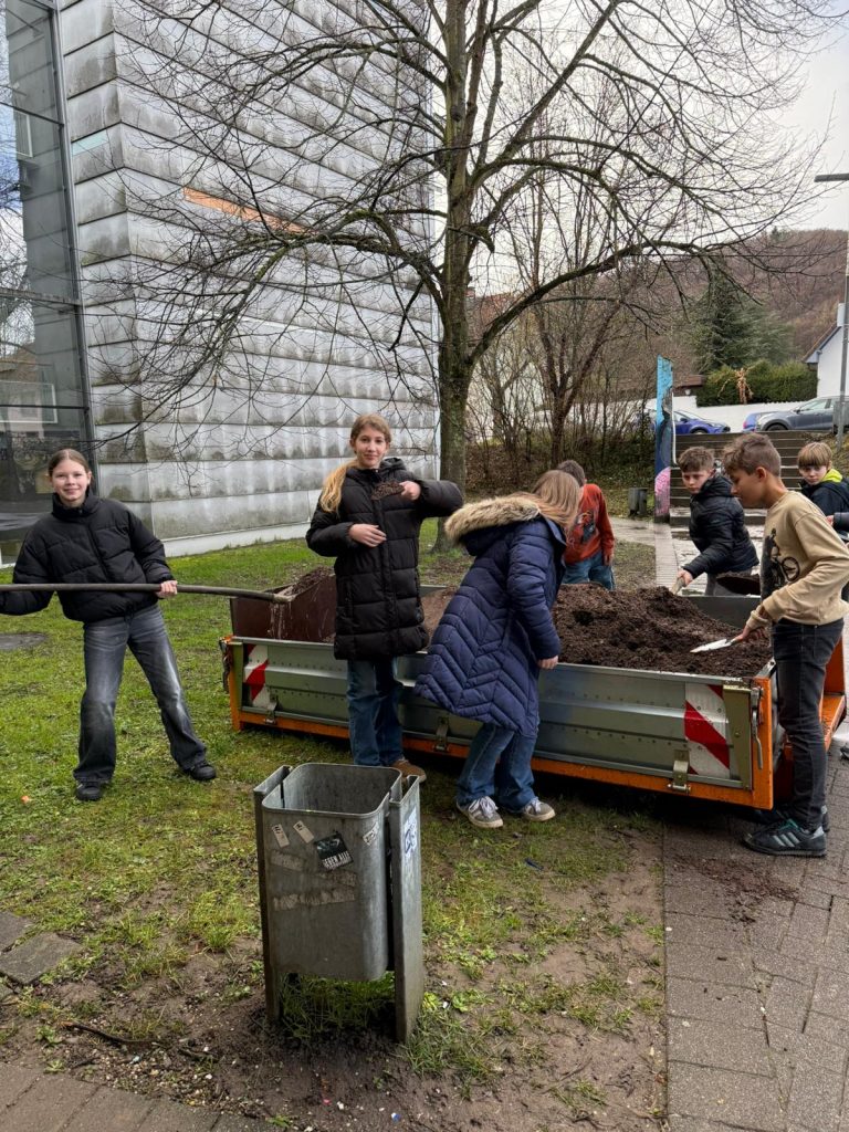 Bevor gesät und gepflanzt werden kann, braucht es eine gute Grundlage. Deshalb lieferte das örtliche Gartenamt frische Erde für unsere Hochbeete. Diese mussten neu aufgefüllt werden, damit Gemüse, Kräuter und Blumen später optimal wachsen können. Tatkräftige Unterstützung kam dabei von der Klasse 7c. Mit Schaufeln, Eimern und jeder Menge guter Laune machten sich die Schülerinnen und Schüler an die Arbeit. Gemeinsam wurde geschleppt, verteilt und glattgestrichen: Teamarbeit vom Feinsten! Dank ihres Einsatzes sind die Hochbeete nun bestens vorbereitet und warten nur darauf, bepflanzt zu werden.